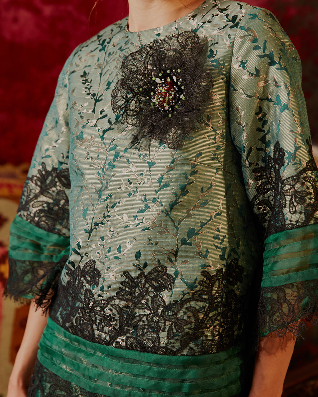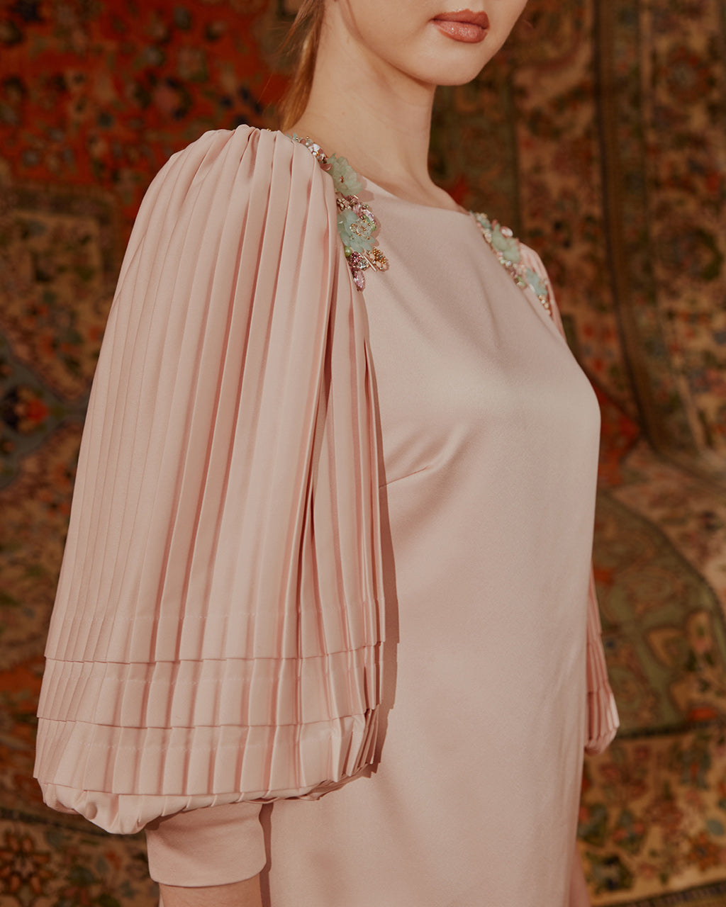 of femininity with artful details and silhouettes. The overall effect strikes an otherworldly elegance. True to INNAI RED aesthetic, premium fabrics and exquisite embellishments in creating looks that pair perfectly with rich carpets from Nasim Carpets. Volume, texture and intricate details are set against sweet palette of pastel, mid-tones and deep jewel tones. Strong modern curves and folds balanced with the intricate beadwork, making it instantly known as INNAI RED.