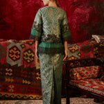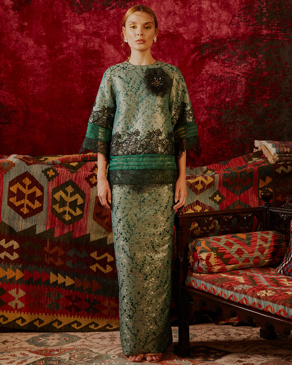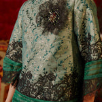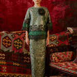 The PARISA kurung kedah is crafted from a subtle leaf-motif brocade that holds the slightly tapered cut well. The sleeves are cut at ¾ length with floral motif lace as well as sheer, pleated silk organza trimming at the hemline and sleeve ends. The hip length, round-neck top is paired with a column cut skirt, punctuated with an oversized flower brooch that is detachable and embellished with crystal beads.