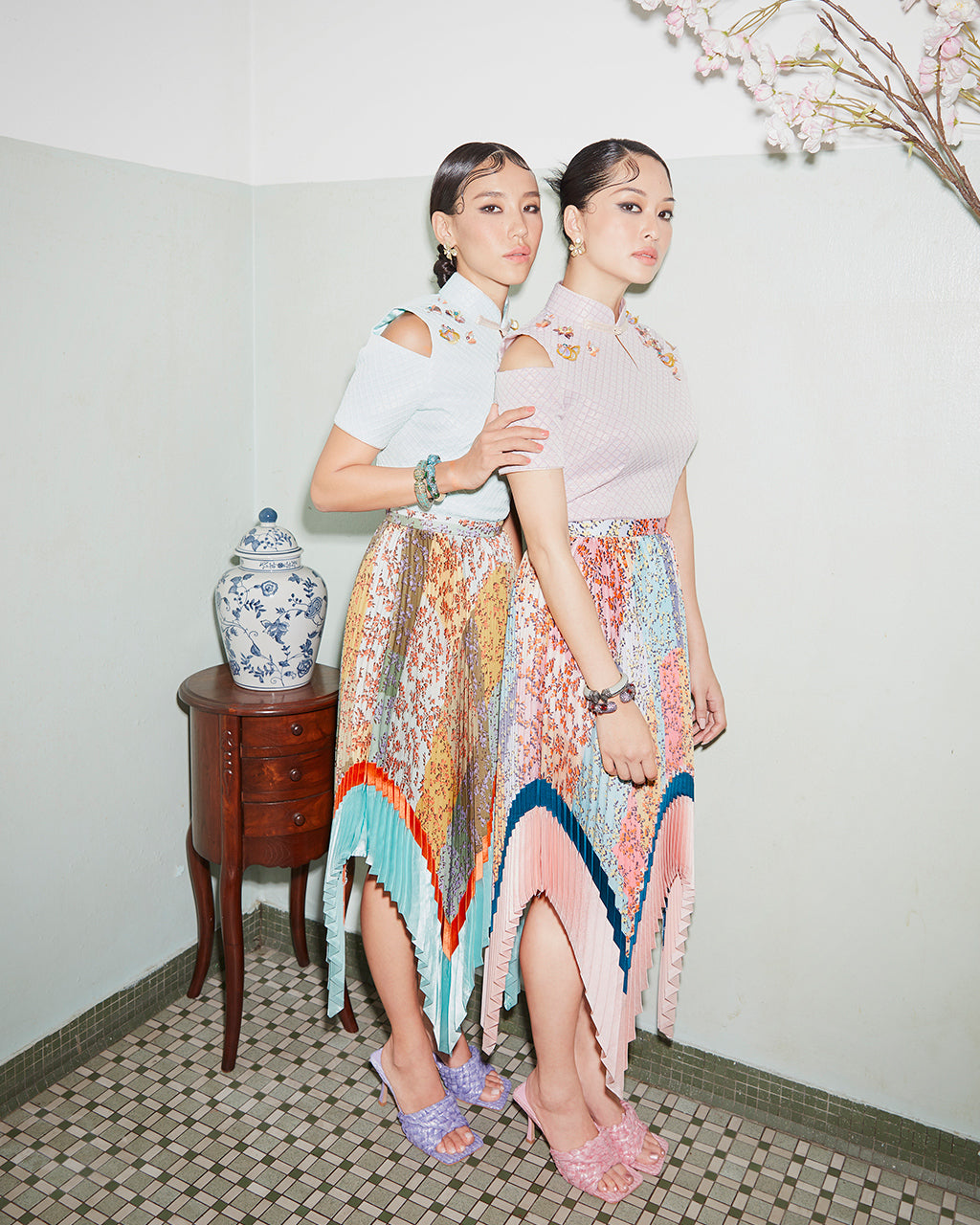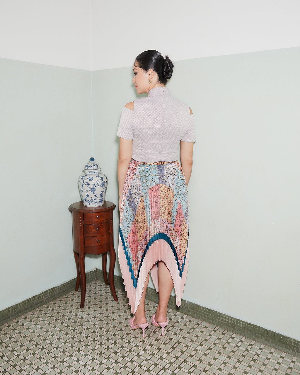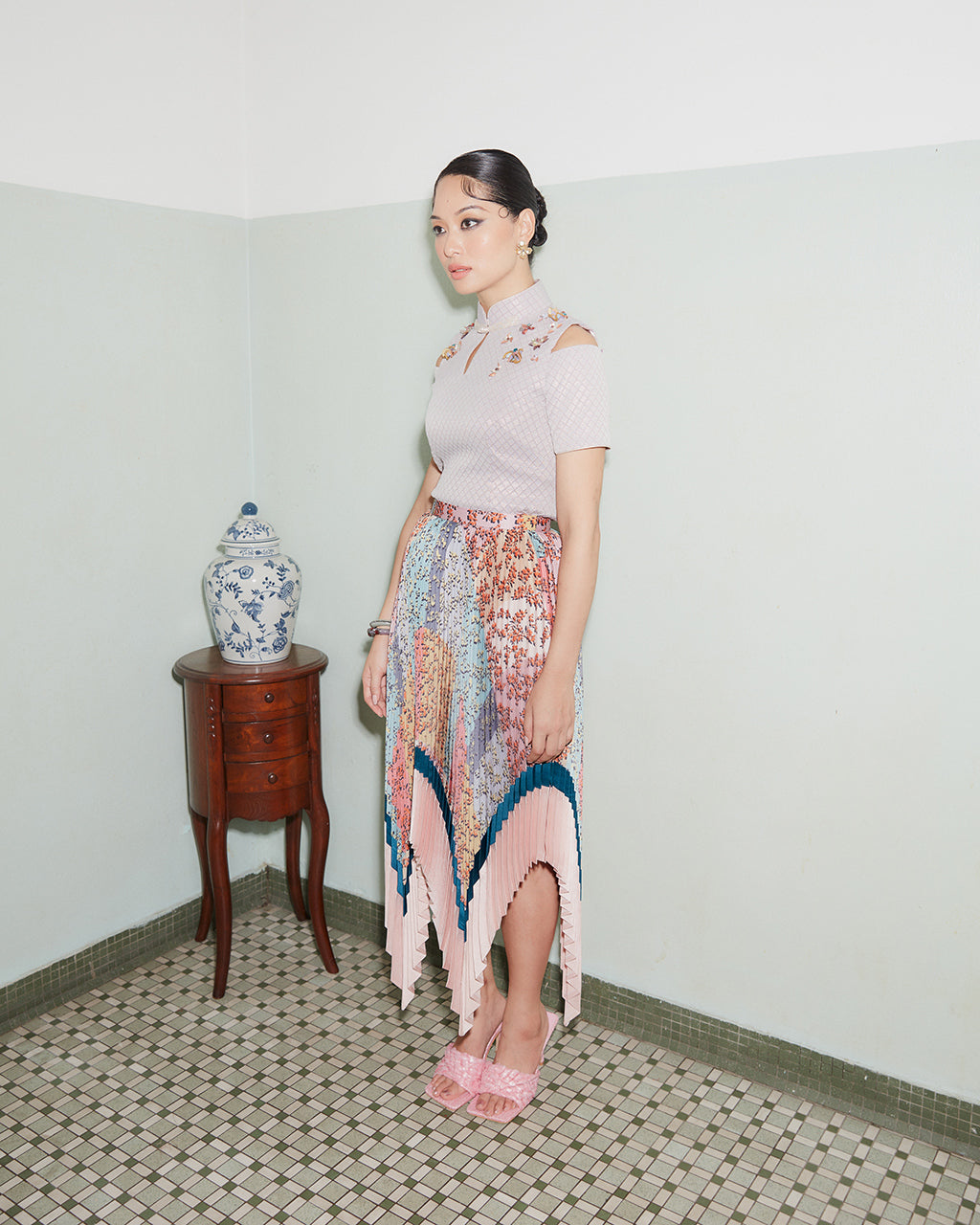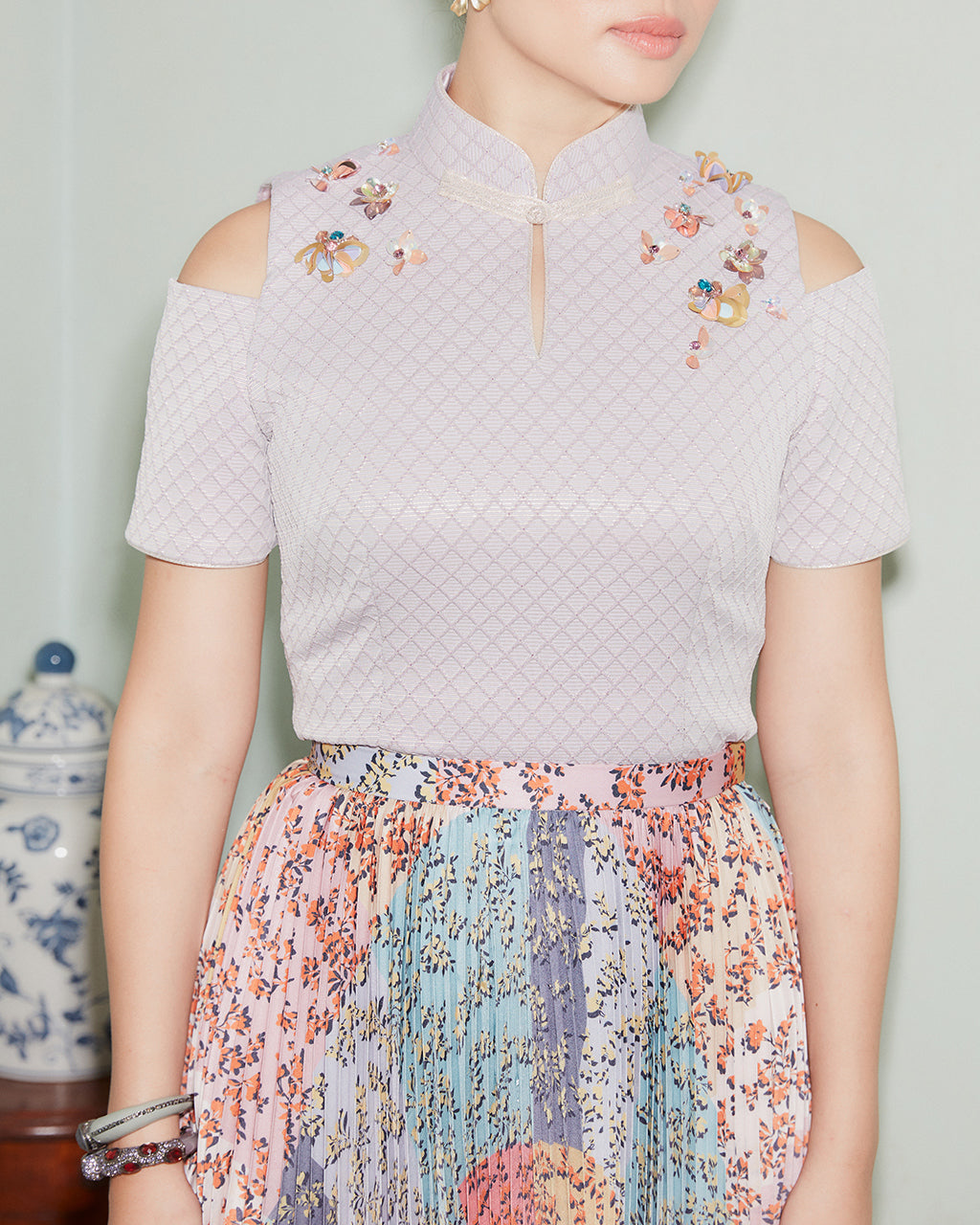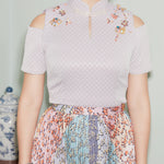 This flirty yet statement design is not just for the festive season, you can wear it with the sunray pleated skirt as a set, or just with a pair of jeans. The cheongsam top is crafted from a subtle textured brocade with metallic thread in a body hugging silhouette. Highlighted with multicolour crystal and sequin beadworks across the shoulder, and short sleeves with cold-shoulder cut-out detail which gives a modern edge on it.