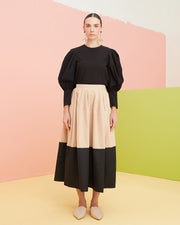With just the right amount of volume and minimal need for styling, this skirt makes a great addition to wardrobe staples. Cut in a semicircle form with tiers, the skirt's prime feature is the subtly textured black brocade panel circling the hemline. This neutral two-toned skirt comes with concealed side pockets and the midi length hemline draws attention to your feet. So, put on your favourite pair.