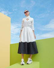 With just the right amount of volume and minimal need for styling, this skirt makes a great addition to wardrobe staples. Cut in a semicircle form with tiers, the skirt's prime feature is the subtly textured black brocade panel circling the hemline. This neutral two-toned skirt comes with concealed side pockets and the midi length hemline draws attention to your feet. So, put on your favourite pair.