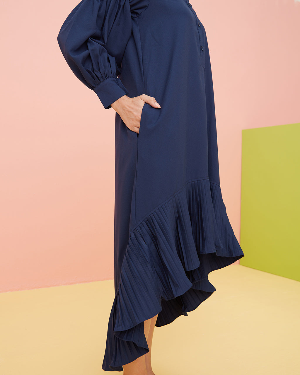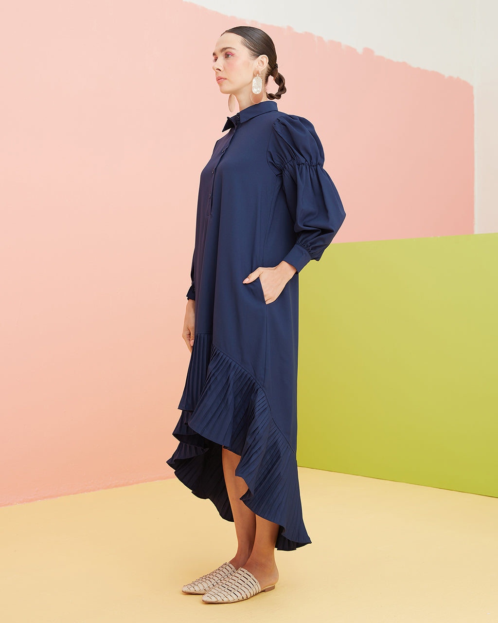 This relaxed shirt dress has a partial buttoned front opening that ends above the waist for ease of wear. The pleated high-low hemline starts above the knee, then dips at an ankle grazing length with the right amount of flair to complete the design.