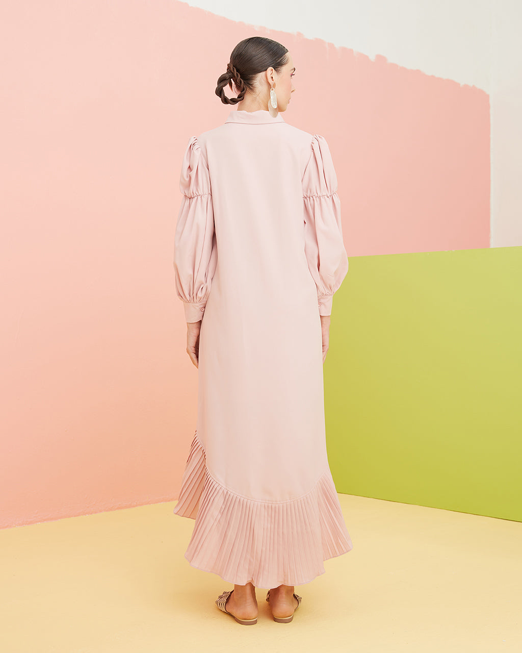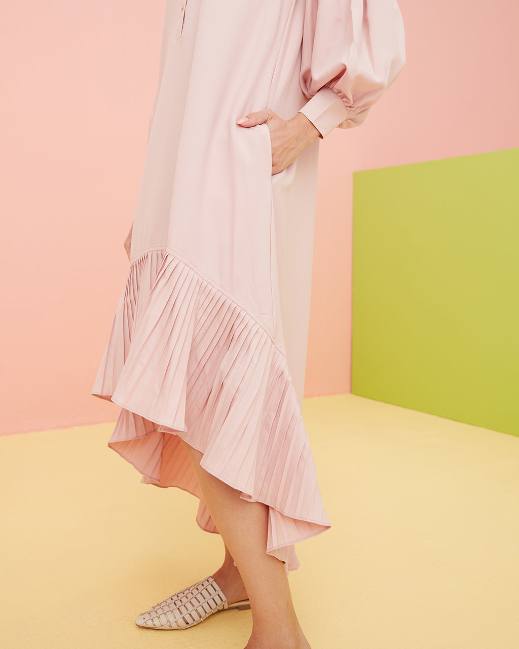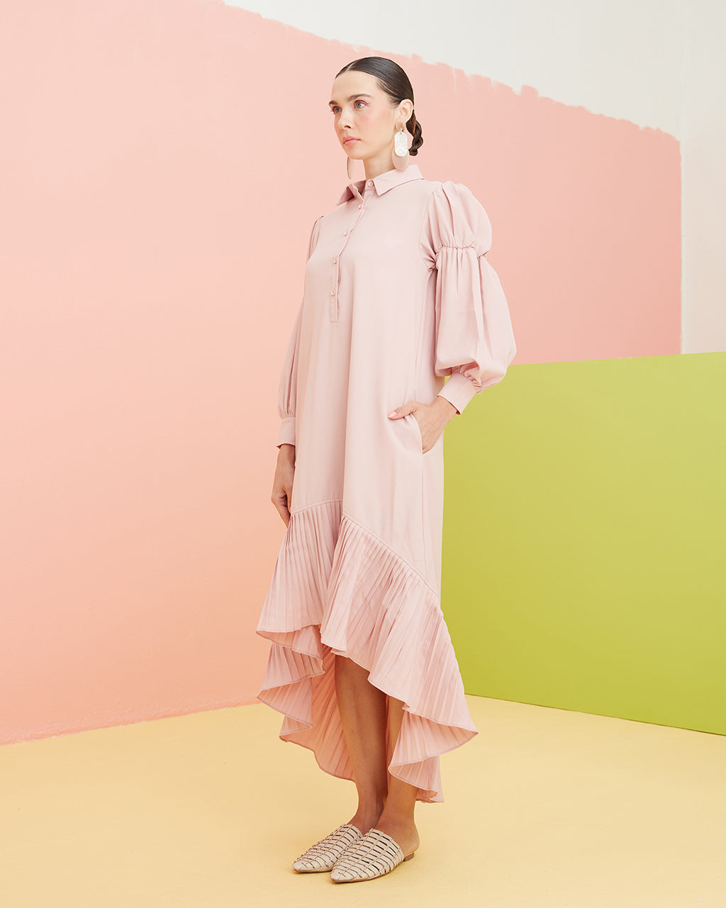 This relaxed shirt dress has a partial buttoned front opening that ends above the waist for ease of wear. The pleated high-low hemline starts above the knee, then dips at an ankle grazing length with the right amount of flair to complete the design.
