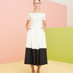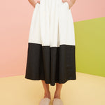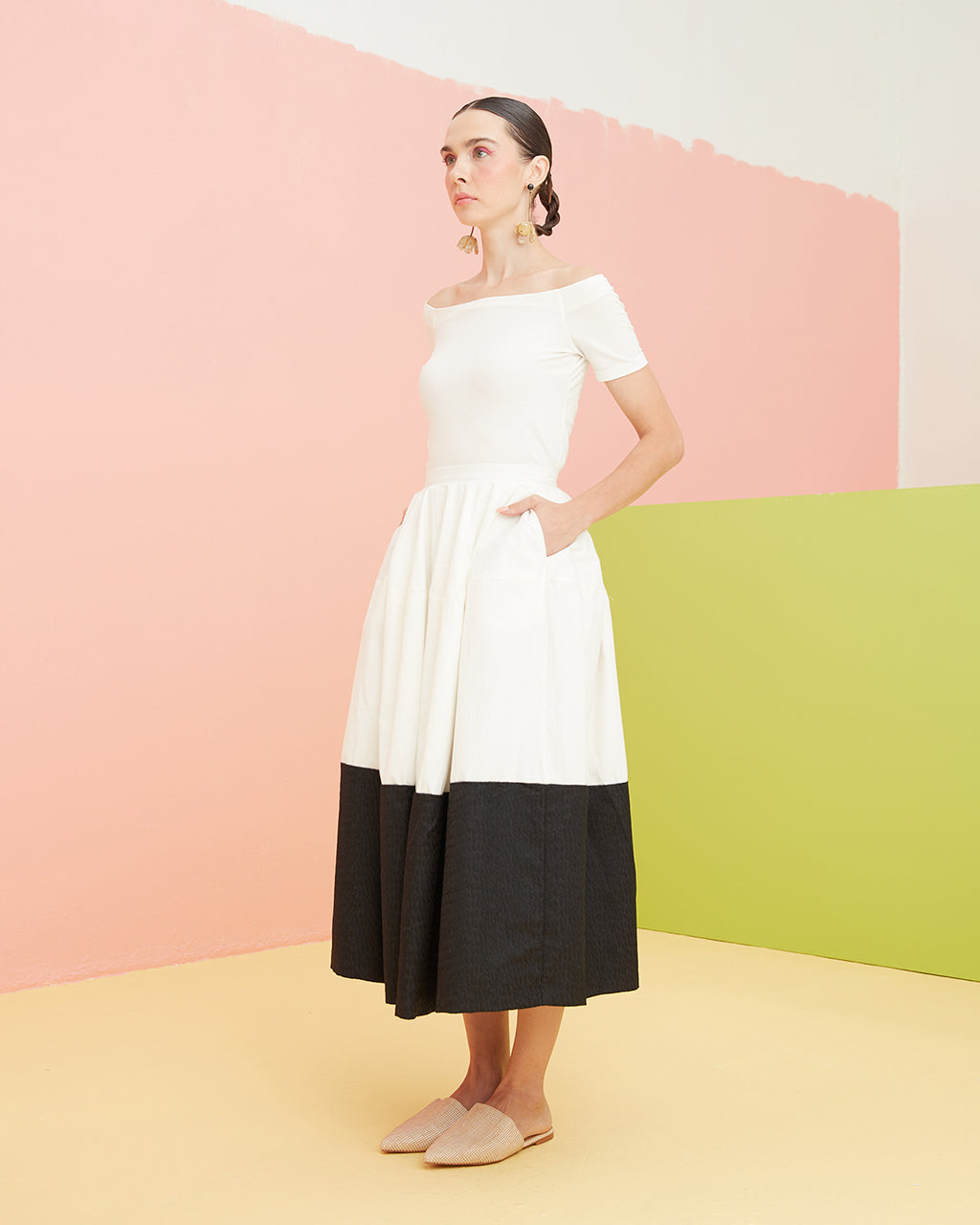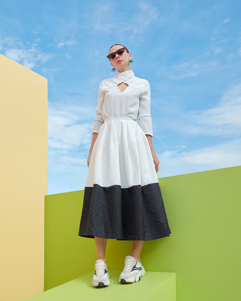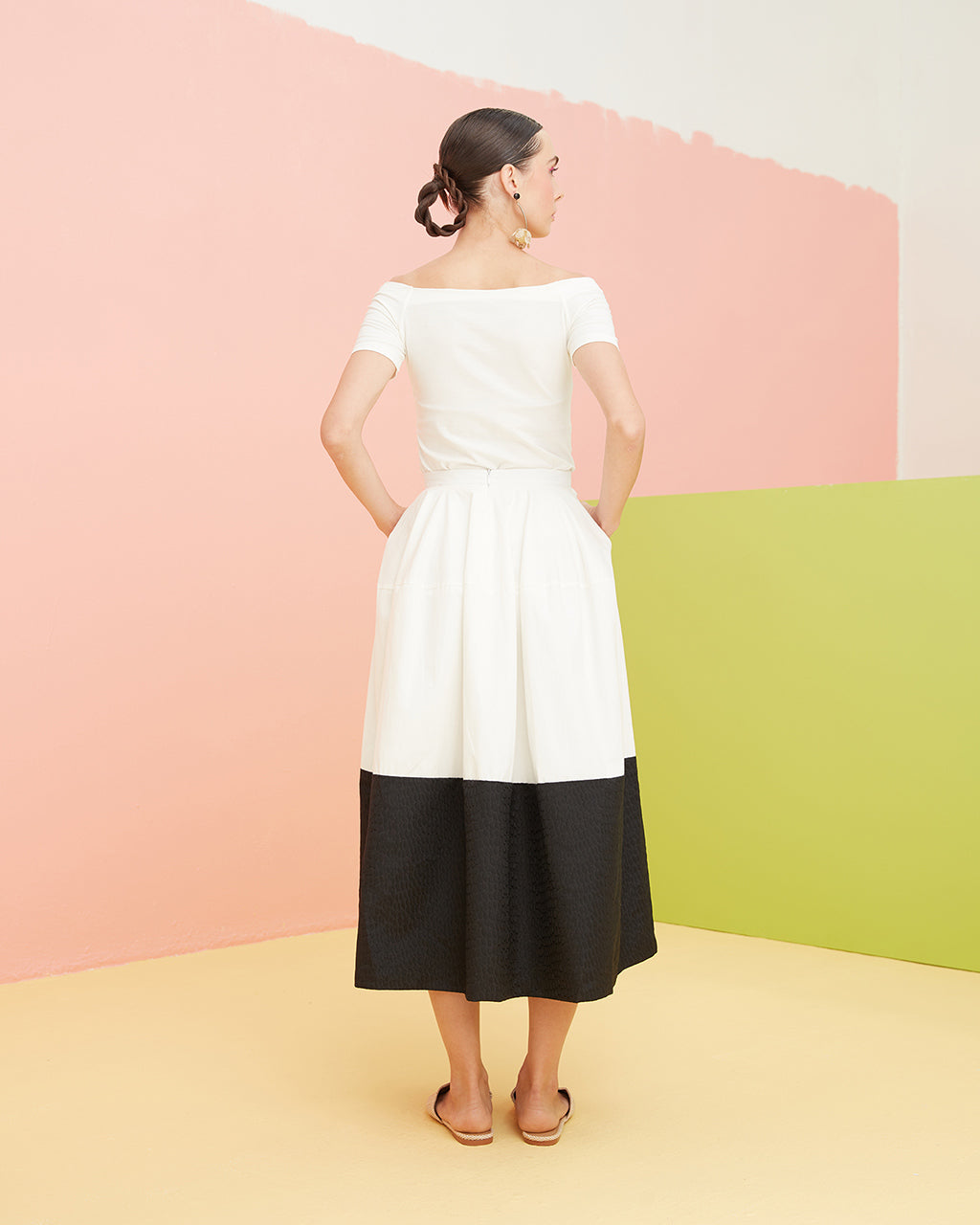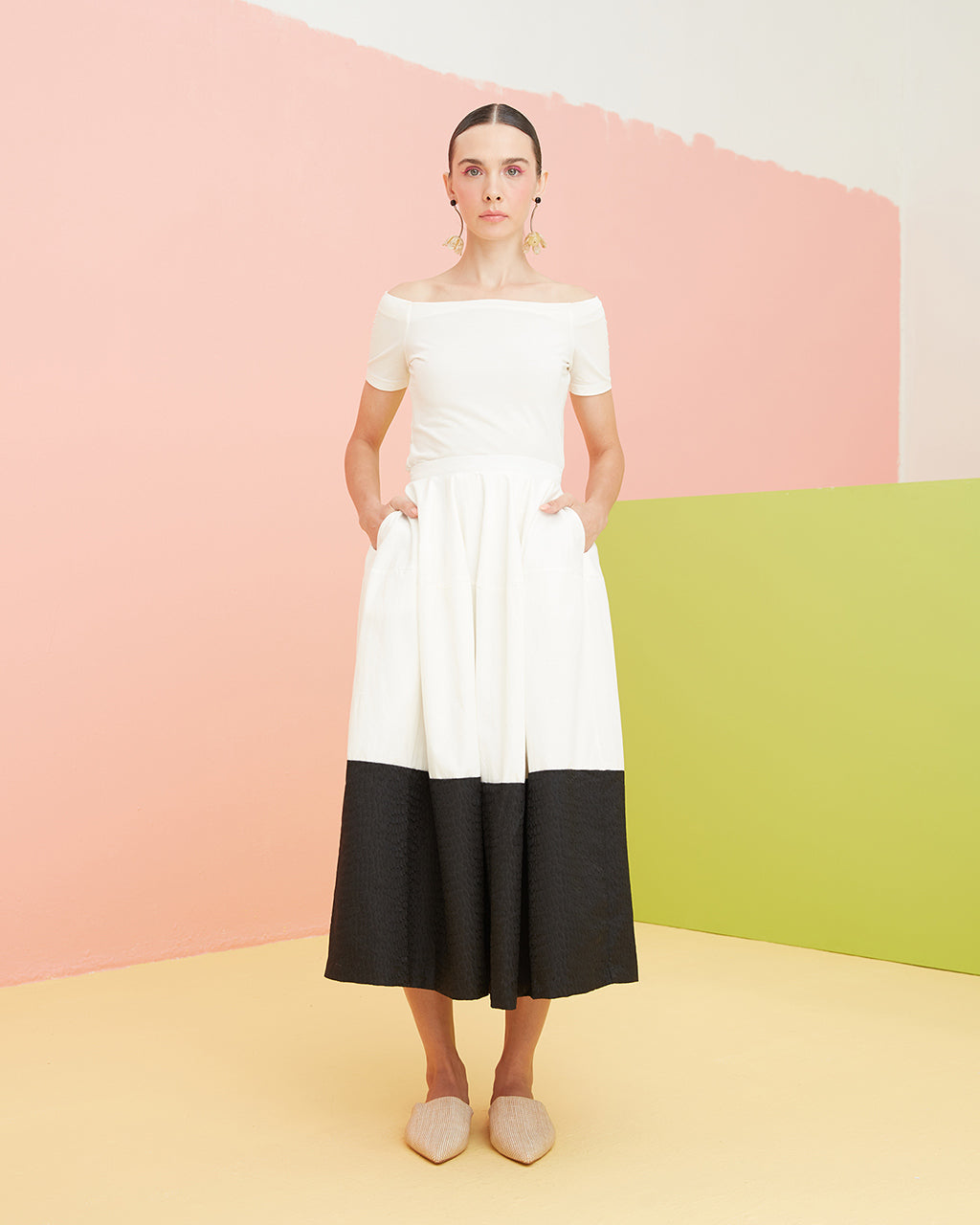 Cut in a semicircle form with tiers, the skirt's prime feature is the subtly textured black brocade panel circling the hemline. This neutral two-toned skirt comes with concealed side pockets and the midi length hemline draws attention to your feet. So, put on your favourite pair.