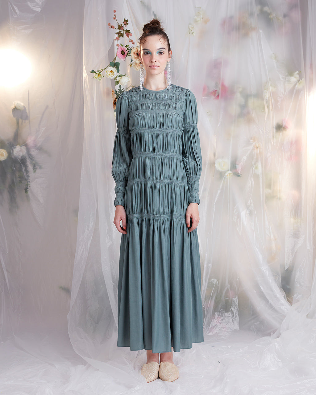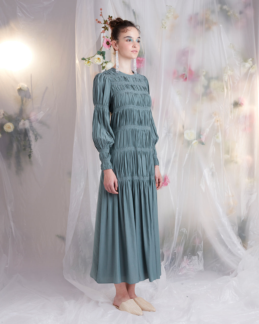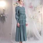 Shirring detail starts from the round neckline, halting at a mid thigh level and continues to a flowy ankle length hemline.
