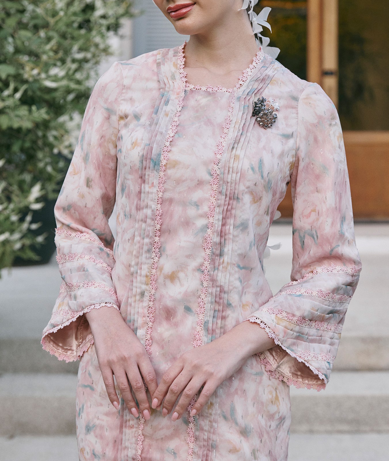 Redefine what it means to be classically beautiful, this semi-fitted long kurung reimagines tradition with a contemporary sensibility. The square neckline frames the décolletage with understated precision, while pintuck panels trail the length of the front, traced with delicate lace trims that synchronise with slight bell sleeves, adding movement and tactile detail.