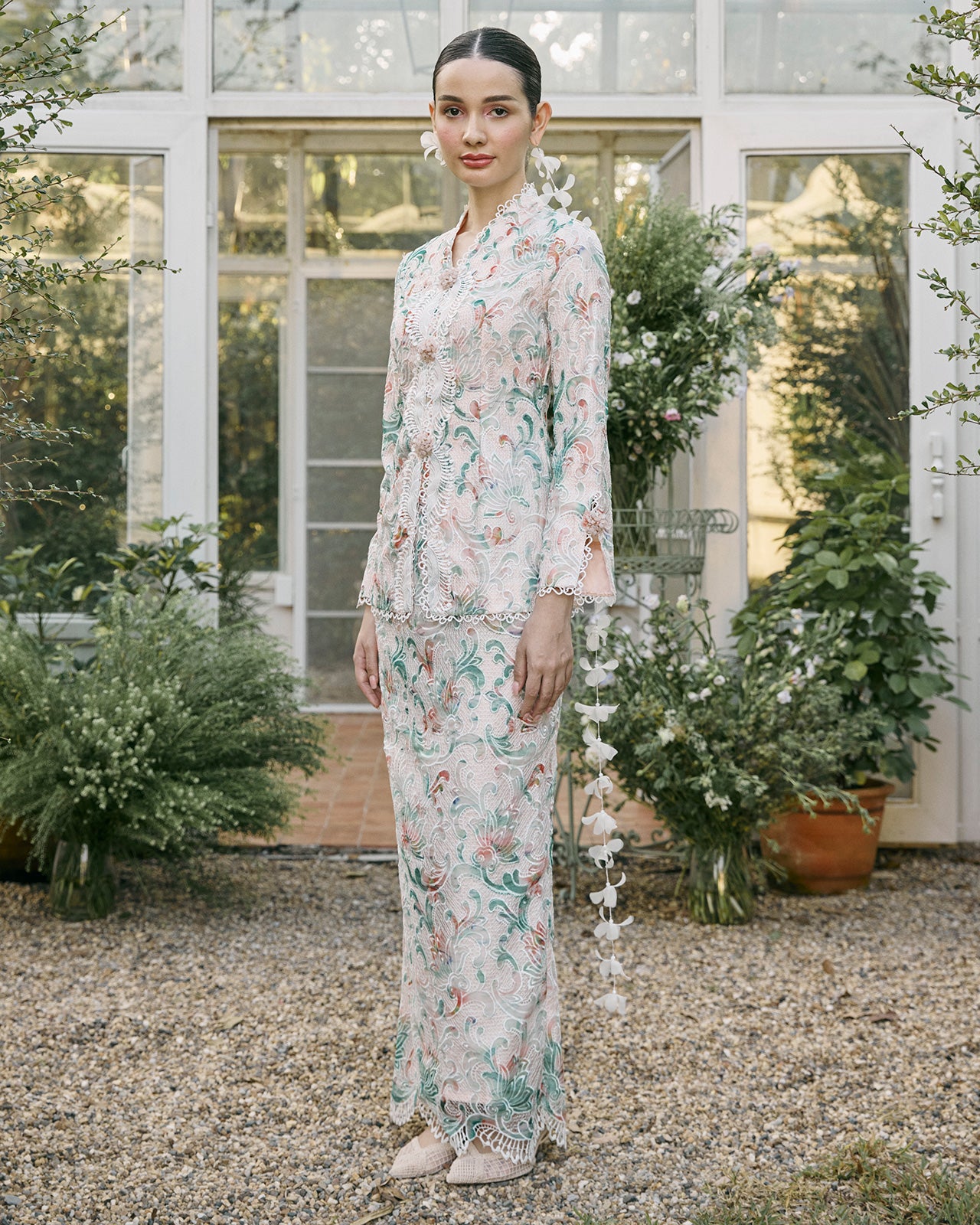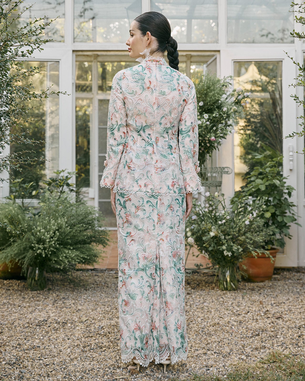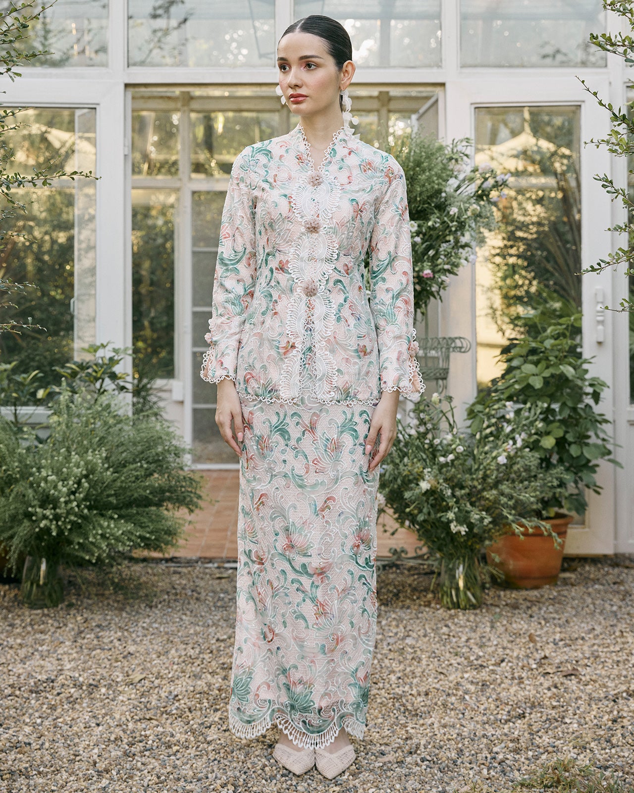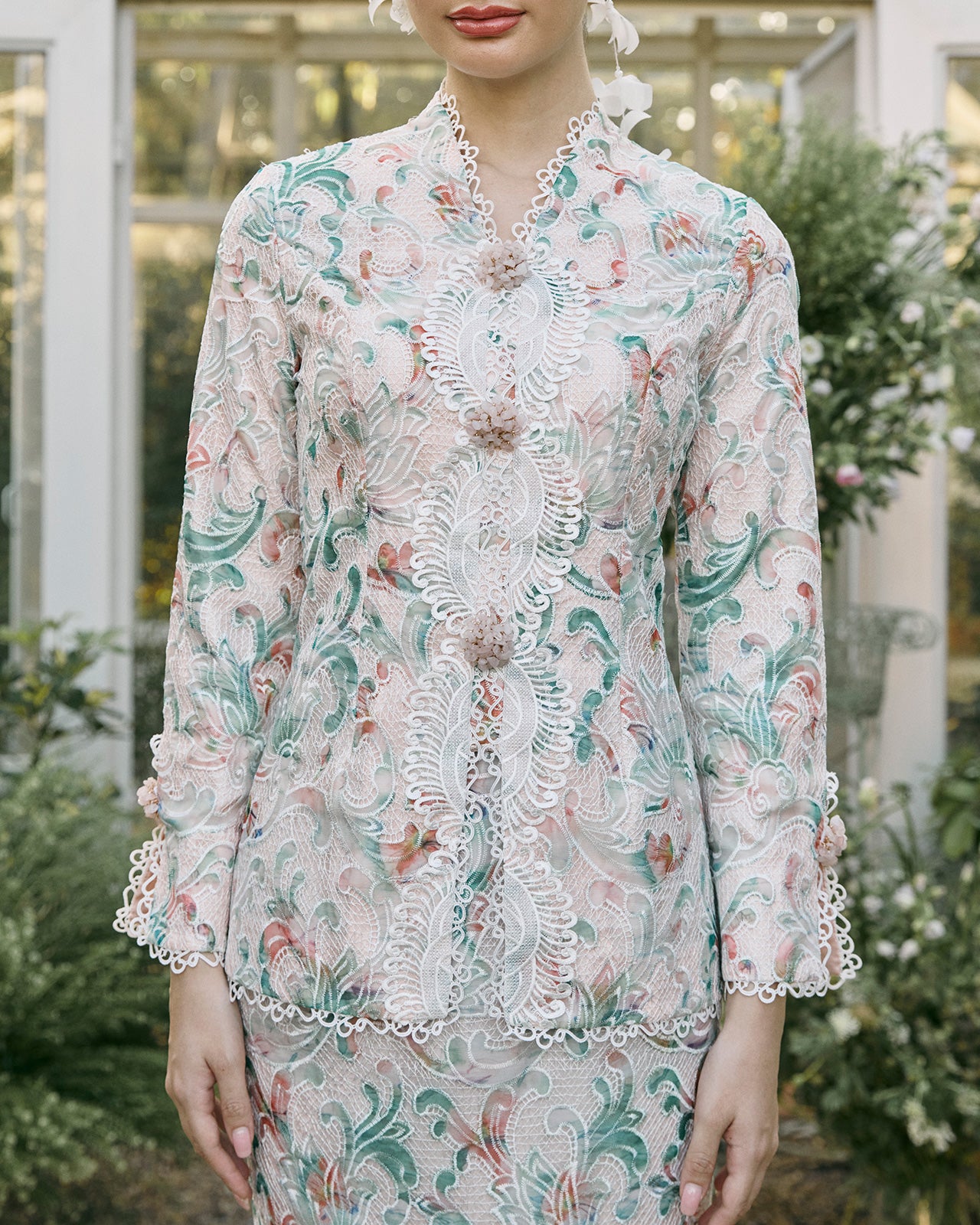 A vision of modern romance, this short kebaya is crafted in guipure lace with intricate peony motifs in harmonious mixed hues that bring depth and softness to the silhouette. Scalloped trims trace the edges with refined delicacy, embellished with cluster brooch beads in a subdued rose quartz tone.