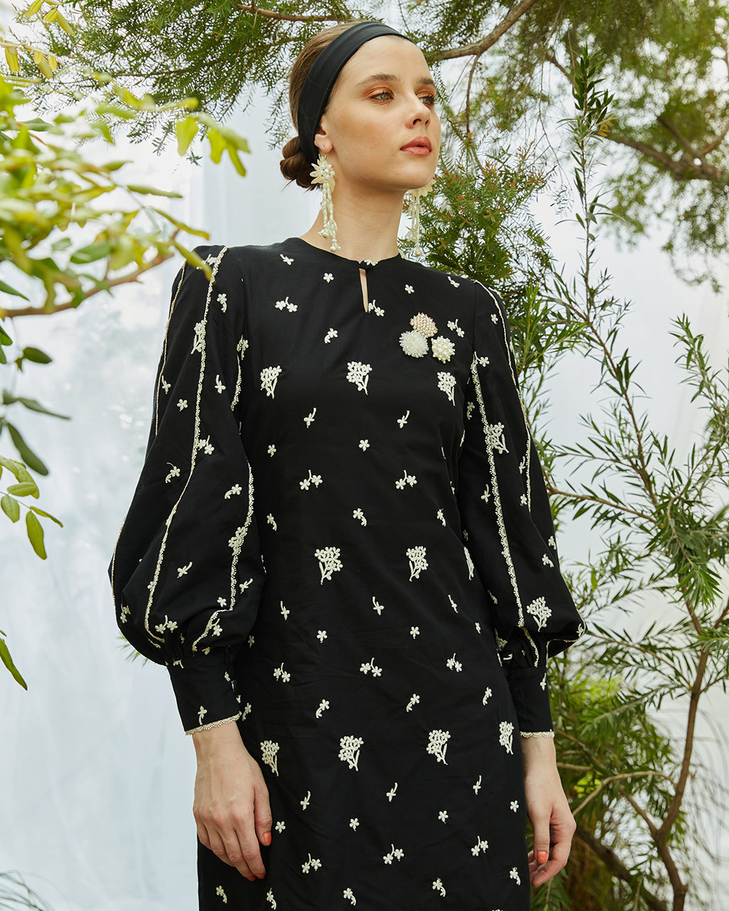 The top features modern detailing of inserted guipure lace trimmed puff sleeves which are cuffed at the wrists, and the signature cluster brooch embellishment made from pearl and crystal beads.