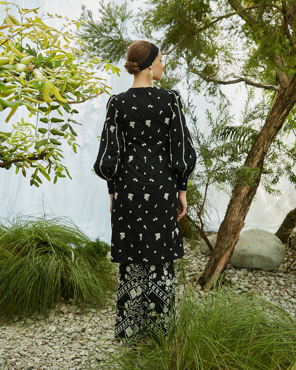 Traditional silhouettes make timeless pieces, like this sophisticated look. Giving nostalgic feels, this relaxed kurung Pahang is crafted with breezy embroidered cotton in floral and geometric motif.