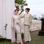 Short but sweet, this kurung kedah embodies romantic, feminine details with understated elegance crafted from a soft textured cotton with intricate off-white embroidery in floral motifs, set against a textured sage background for contrast.