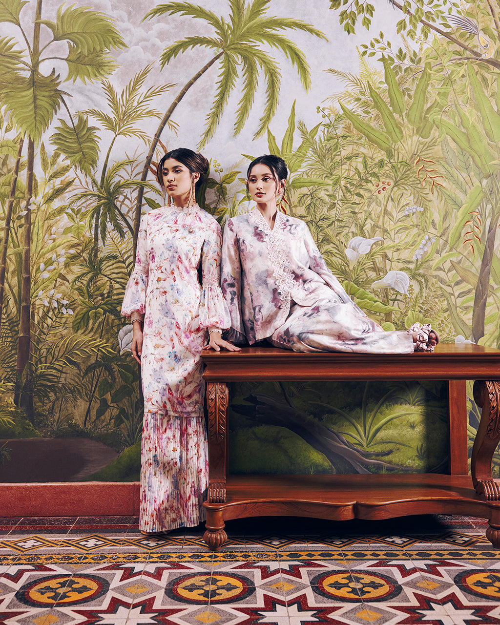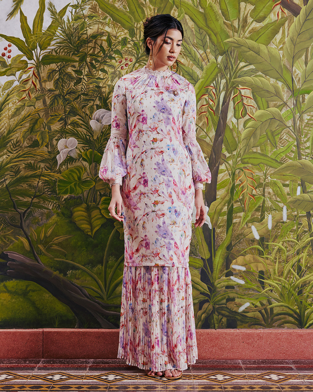 Captivating watercolour inspired floral print in soft lilac, coral and blush tones create a dreamy fusion of modernity and romance with this long modern kurung, embellished with matching floral accent brooch beads.