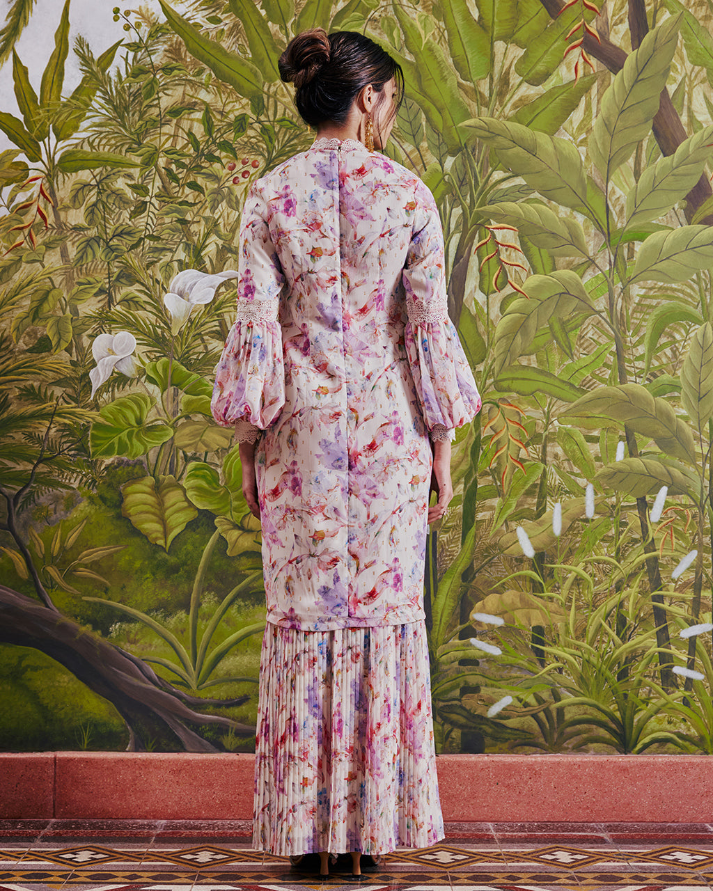 Watercolour Floral Printed Long Kurung With Bubble Sleeves & Pleated Mermaid Skirt