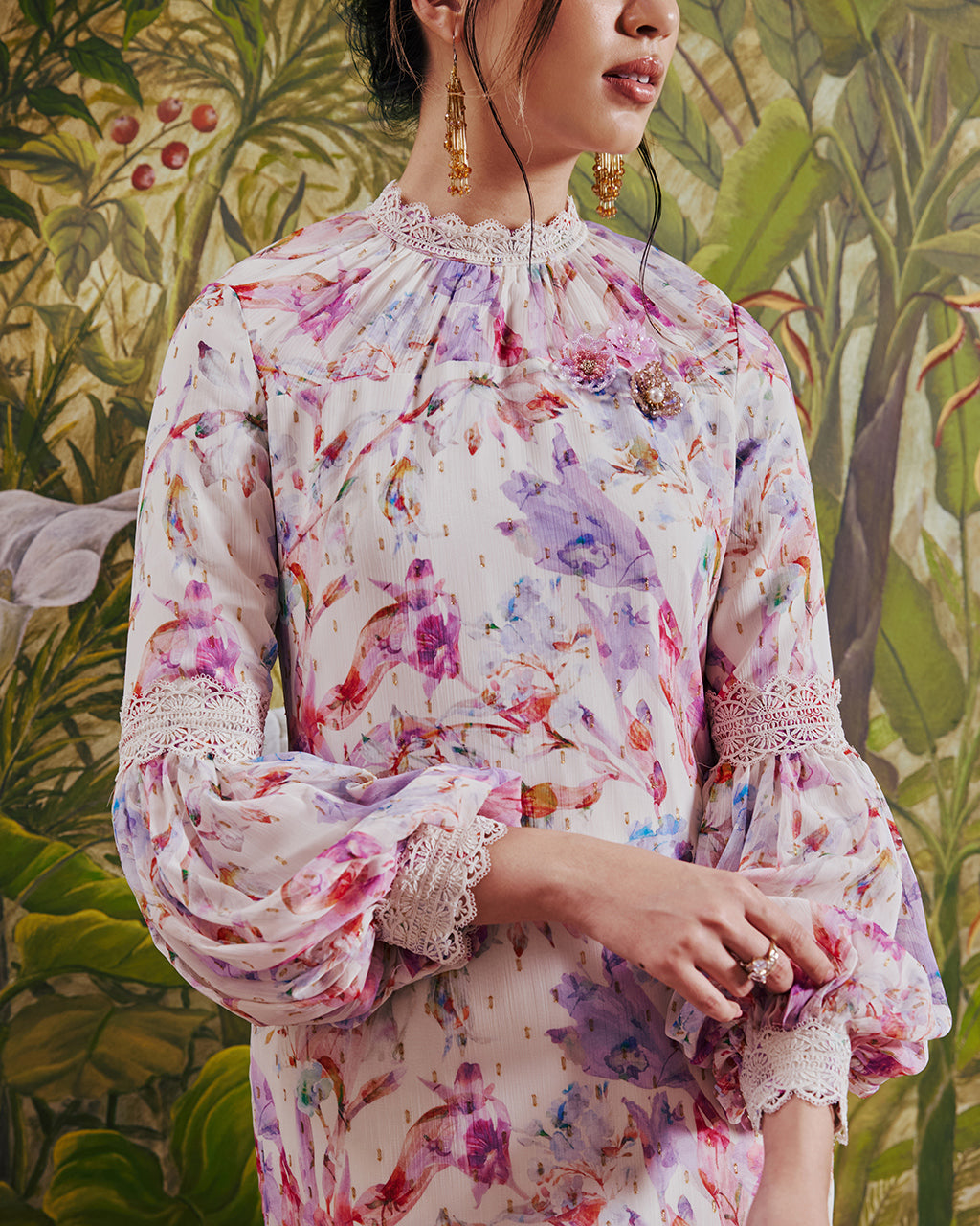 Watercolour Floral Print Chiffon & Guipure Lace Trim